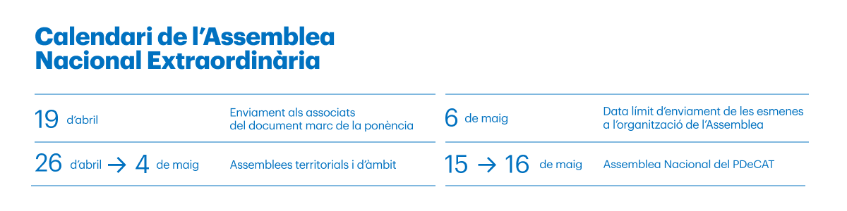 El 19 d’abril el PDeCAT va enviar la proposta de ponència als associats per aquest congrés telemàtic, i cal recordar que es poden aportar esmenes en un període previ al 6 de maig quan les direccions de les vegueries i dels àmbits han de trametre-les al comitè organitzador de l’Assemblea Nacional. Serà el mateix 15 de maig quan es votaran les esmenes. La finalitat d’aquesta assemblea és la de modificar els Estatuts (Ponència Organitzativa) i d’elegir els òrgans col·legiats i càrrecs unipersonals del partit.